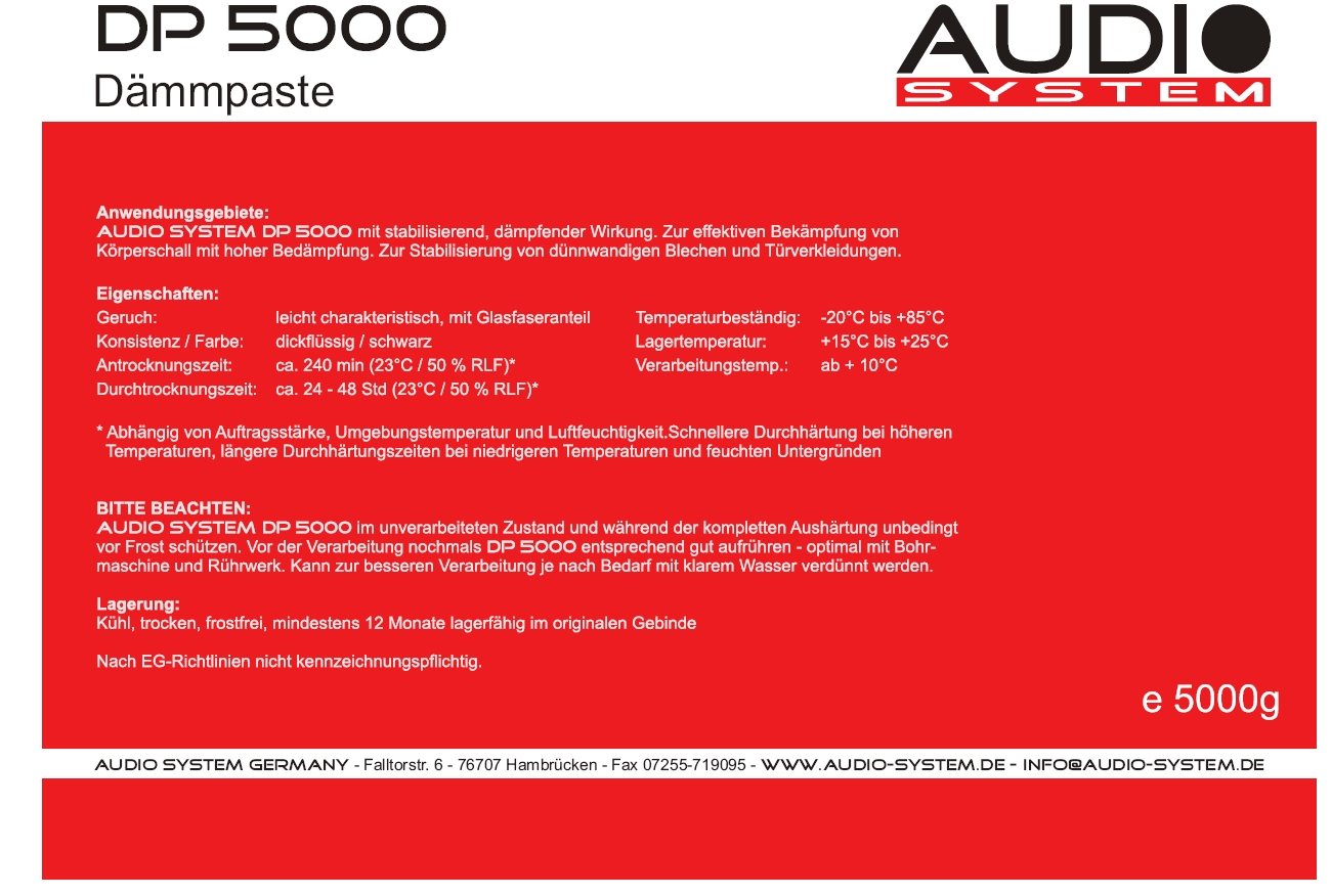 | Audio System DP-5000 - antivibrační tlumící pasta balení 5 kg minimalizuje okolní hluk, snižuje vibrace, zlepšuje kvalitu zvuku audioaparatury, bez rozpouštědel, ředitelné vodou, vysoký obsah skelných vláken, i po zaschnutí zůstává flexibilní, drží na všech odmaštěných podkladech (dřevo, kov, plasty), hladké plasty nutno zdrsnit, nanášení stěrkou nebo štětcem, při tlouštce vrstvy 3 mm postačí balení na dvoje dveře, tvrdnutí cca 8-12 hod. při teplotě 20 st., po otevření nutno spotřebovat do 4 měsíců |